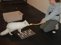 Hago el entorno totalmente diferente al de una sesión normal. Por ejemplo, en lugar de una bolsa lateral, escondo las golosinas en un lugar al que puedo llegar rápidamente. Intento no hacer que esta nueva etapa parezca una sesión de entrenamiento . Me aseguro de que no haya un lugar para ir a la estación, y coloco algún objeto en el centro de la habitación. El animal usualmente revisará el objeto, y yo hago click y refuerzo su iniciativa (en las sesiones de captura, generalmente lanzo el refuerzo al suelo). La primera sesión de captura es la más difícil porque el animal debe iniciar la acción sin mi guía, solo puedo hacer click. A veces necesito moverme por la habitación, para que el objeto quede entre el animal y yo, hasta que el animal descubre que debe iniciar el comportamiento.